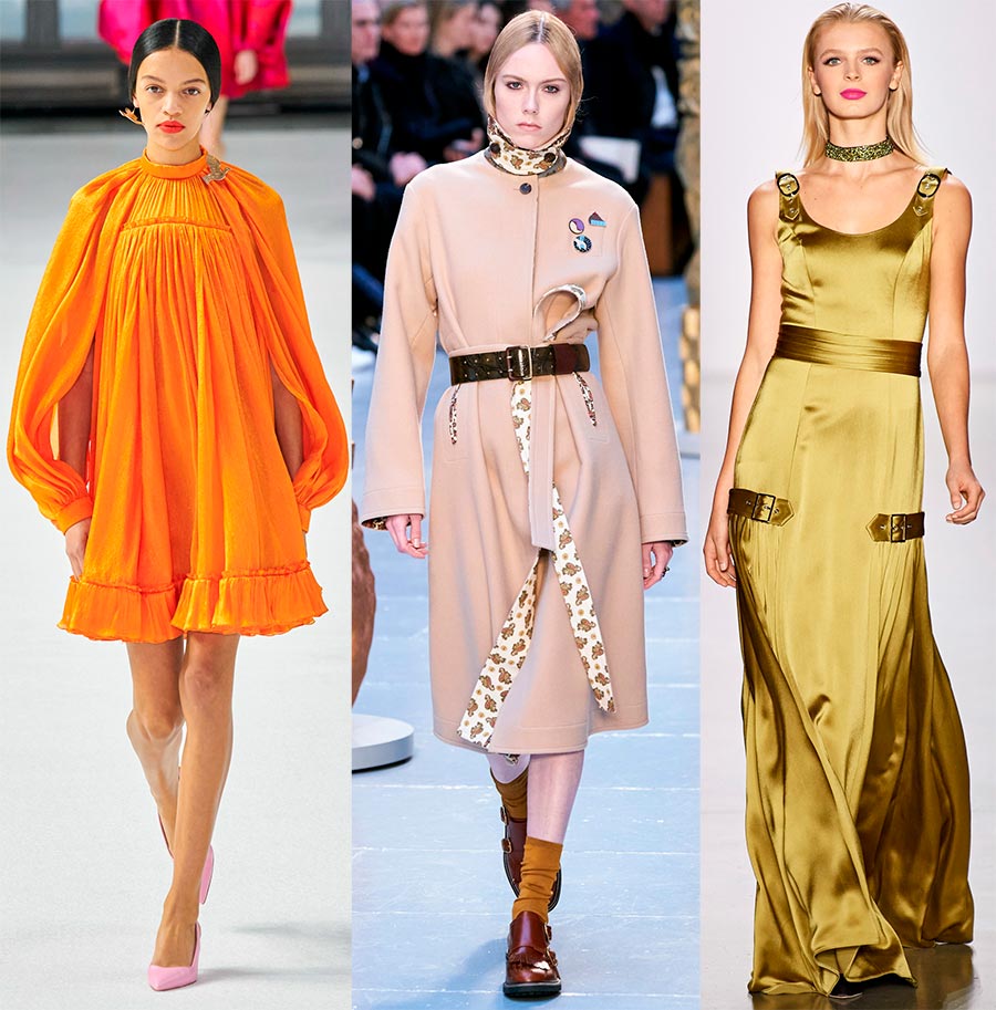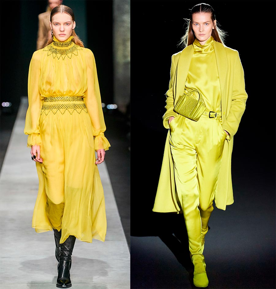 Presque toute la gamme jaune - surtout sable, teintes pêche, ambre-orangé et même jaune-vert, on les a vus en abondance à la Fashion Week de Paris, New York, Milan et Londres.