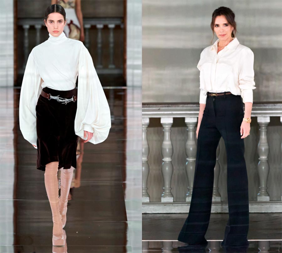 Victoria elle-même est allée s'incliner après le spectacle dans une chemise blanche à manches légèrement retroussées et un pantalon noir. Mais ses mannequins défilaient sur les podiums dans des looks féminins. Les blouses de la marque ont des manches volumineuses.