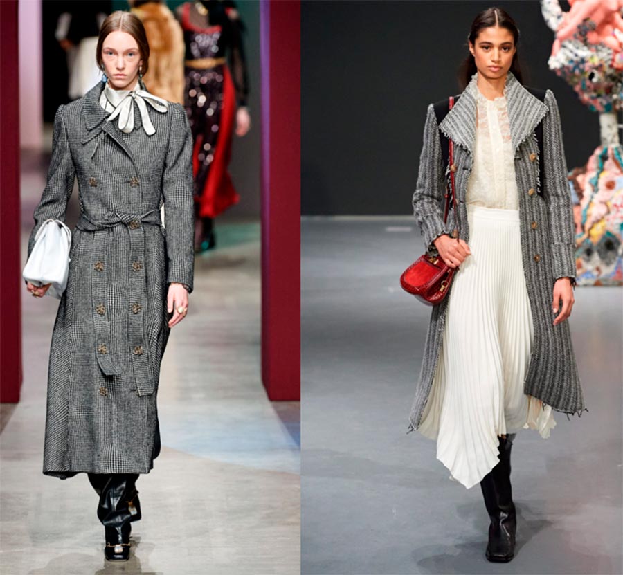 Manteau gris - classique, base, style.Vous pouvez jouer sur l'unité et la lutte des contraires, en combinant un chemisier romantique blanc avec un nœud avec un manteau gris prim et strict.