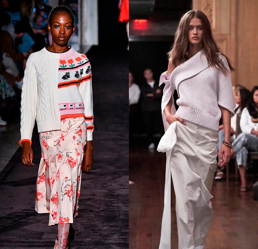 costumes en jersey deux en acier du haut / du pull et de la jupe. Le haut peut être avec ou sans manches, en forme de col roulé ou de golf, ou encore en forme de pull assez volumineux. Les jupes peuvent également être de styles et de longueurs très différents, allant des jupes crayon courtes, serrées ou droites jusqu'au genou, et se terminant par des jupes midi larges évasées avec des plis. Nous avons vu de tels modèles chez Marco de Vincenzo, Prada, Anteprima, Altuzarra, Mark Fast, Elisabetta Franchi, Prada et Sportmax.