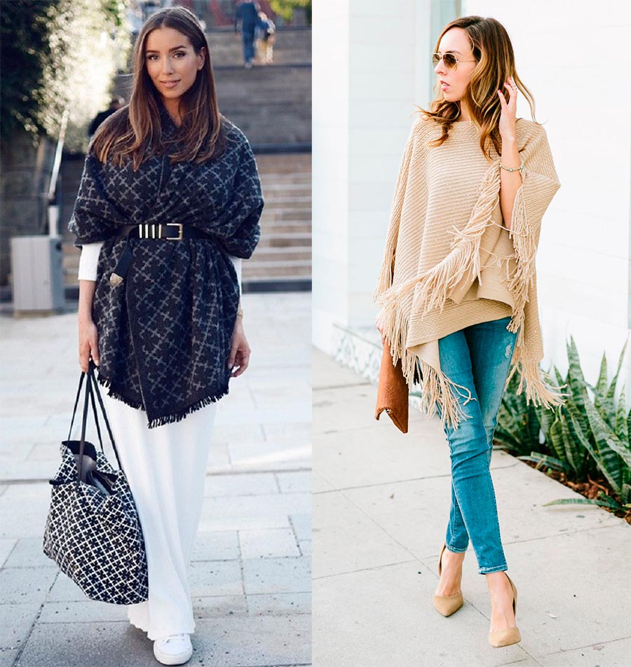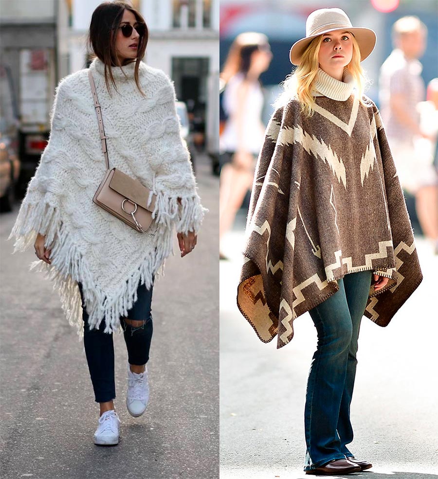 poncho (Zimmermann, Sally LaPointe). C'est une solution excellente et très simple : avec un minimum de compétences en tricot, vous pouvez «créer» vous-même un poncho. Il n'a qu'une fente pour la tête et le poncho s'enfile par dessus la tête. Il n'y a pas de manches, mais le corps est parfaitement réchauffé justement parce qu'il est à l'intérieur de la cape. Le poncho peut être enveloppant et même avec une ceinture, mais toujours sans manches.