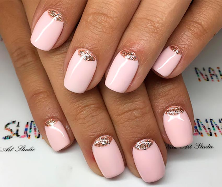 L'or convient moins au rose, il vaut la peine de l'utiliser si vous portez des bagues en or jaune sur vos mains. Et oui, les tons vifs de rose, néon ou fuchsia auront l'air assez vulgaires avec des paillettes. Par conséquent, choisissez des couleurs pastel claires.