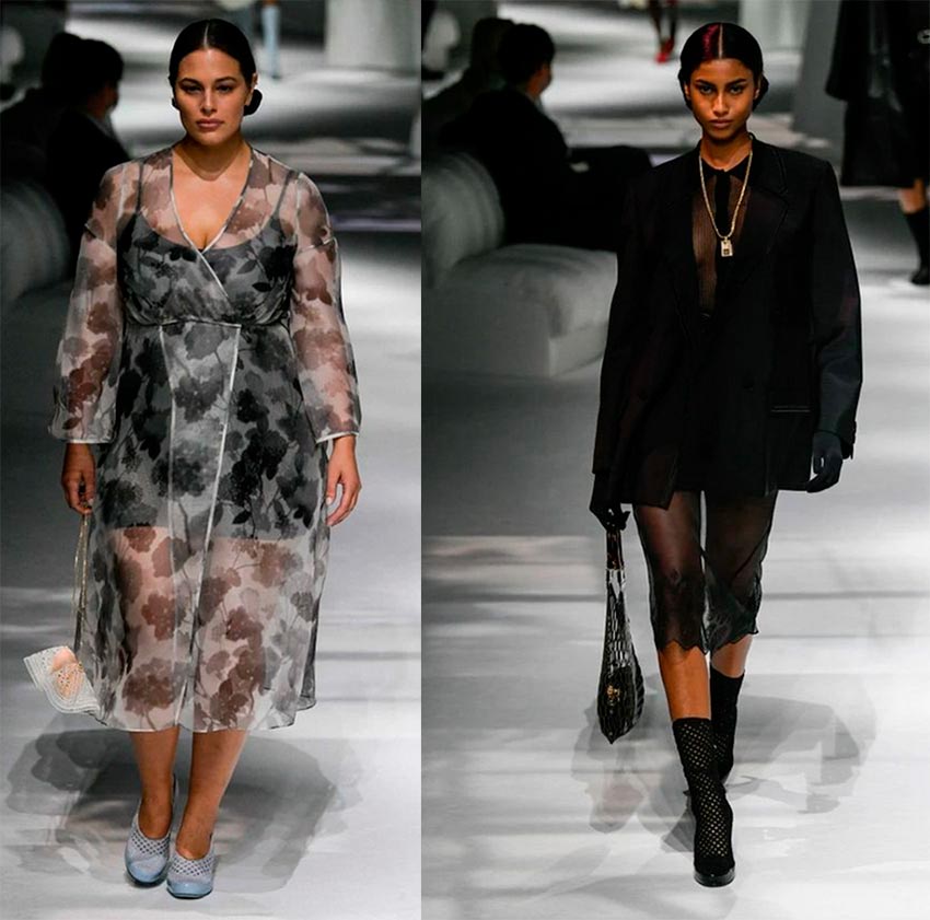 Des éléments transparents d'images ont été montrés sur le podium par de nombreuses marques. Fendi démontre que non seulement les filles minces peuvent intégrer cette tendance dans leur garde-robe, mais aussi les filles rondes. La transparence n'est en aucun cas une nouveauté, en particulier pendant la saison estivale et les robes de soirée, mais en 2026, les robes et autres éléments transparents de la garde-robe féminine forment une tendance de la mode particulièrement pertinente. L'essentiel est de ne pas en faire trop, car la transparence n'est pas de mise partout, et c'est bien avec modération.
