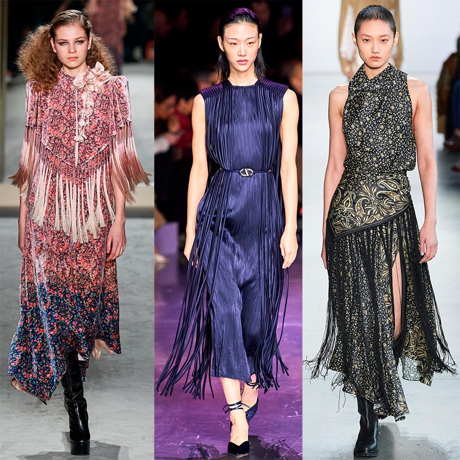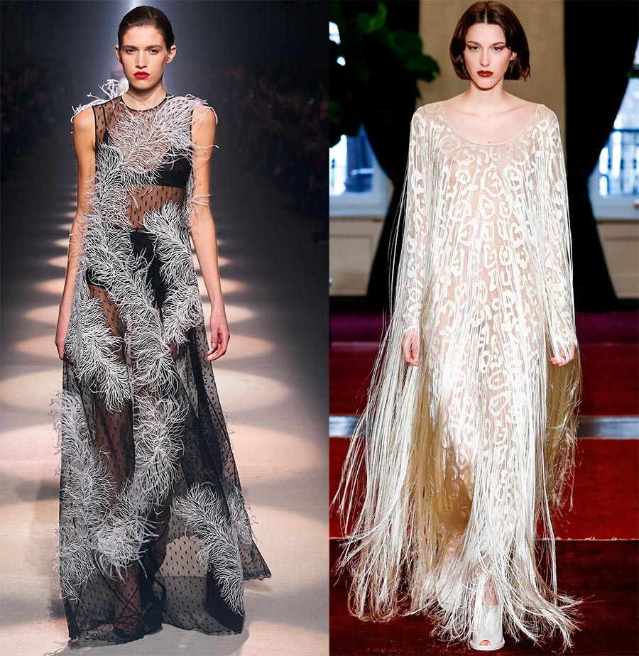 Si vous souhaitez décorer votre robe avec des plumes, vous devez absolument vous tourner vers les collections - Jason Wu, Marchesa, Monique-Lhuillier, Huishan Zhang. Mais vous trouverez des franges dans presque toutes les collections. La plupart des modèles, en particulier ceux avec des plumes, sont réservés aux tenues de soirée.