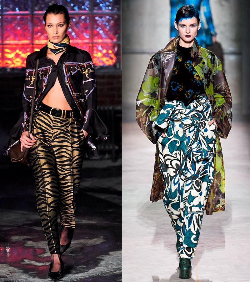 Bien sûr, les carreaux et les rayures entrent dans cette catégorie, mais les maisons de couture ont décidé de rejouer le motif classique. Chanel, Dior et LV ont montré des pantalons à larges rayures. L'abstraction dans les collections de Dries van Noten, Armani et Alexander McQueen est similaire à l'art contemporain que vous souhaitez délibérément considérer. Les motifs fantaisie ajoutent chic et farniente à l'image. L'imprimé animalier, comme Khaite et Nicole Miller, est une option pour les filles audacieuses qui n'ont pas peur des expériences à la mode.