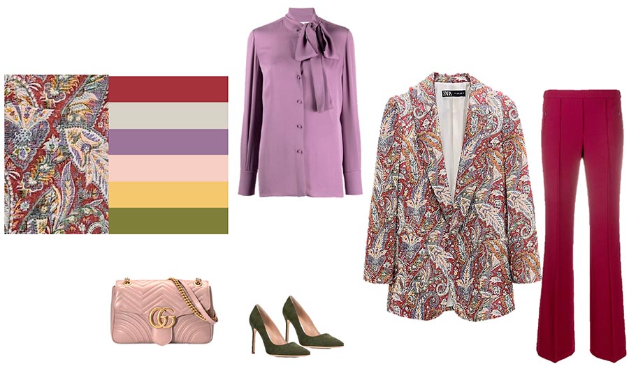 Regardons maintenant un exemple pratique de construction d'une image avec une chose imprimée. L'un des schémas de base pour créer un ensemble avec un article imprimé (à partir duquel vous pouvez éventuellement obtenir une "colonne vertébrale" de couleur pour créer toute une capsule de garde-robe) sera le schéma de la "séparation de la palette de couleurs de l'imprimé ." Par exemple, nous sommes tombés amoureux d'une veste à carreaux. Tout y est beau : la coupe, la couleur et le tissu. Comment choisir des articles de couleur assortie pour cela? C'est très simple : nous sélectionnons des choses de ces couleurs et nuances qui sont présentes dans l'imprimé de la veste. La figure montre un exemple illustratif pour une meilleure compréhension.