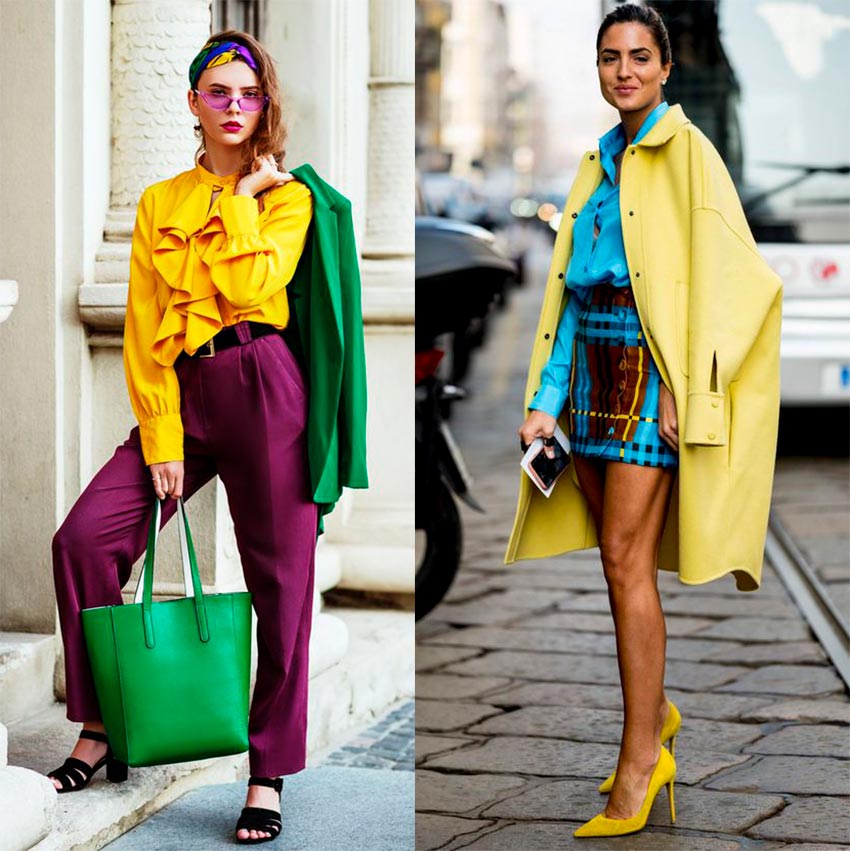 Un autre schéma très simple de couleur "domptable" (et d'impression aussi) est une option pour combiner des vêtements de couleurs vives avec des achromats et des couleurs neutres. C'est juste une aubaine pour ceux qui commencent tout juste à introduire des choses colorées dans leur vie quotidienne. Ici, un rôle important est joué par le rapport proportionnel entre lumineux et neutre (achromatique) - plus la zone occupée par un point lumineux est grande, plus notre image sera dynamique.
