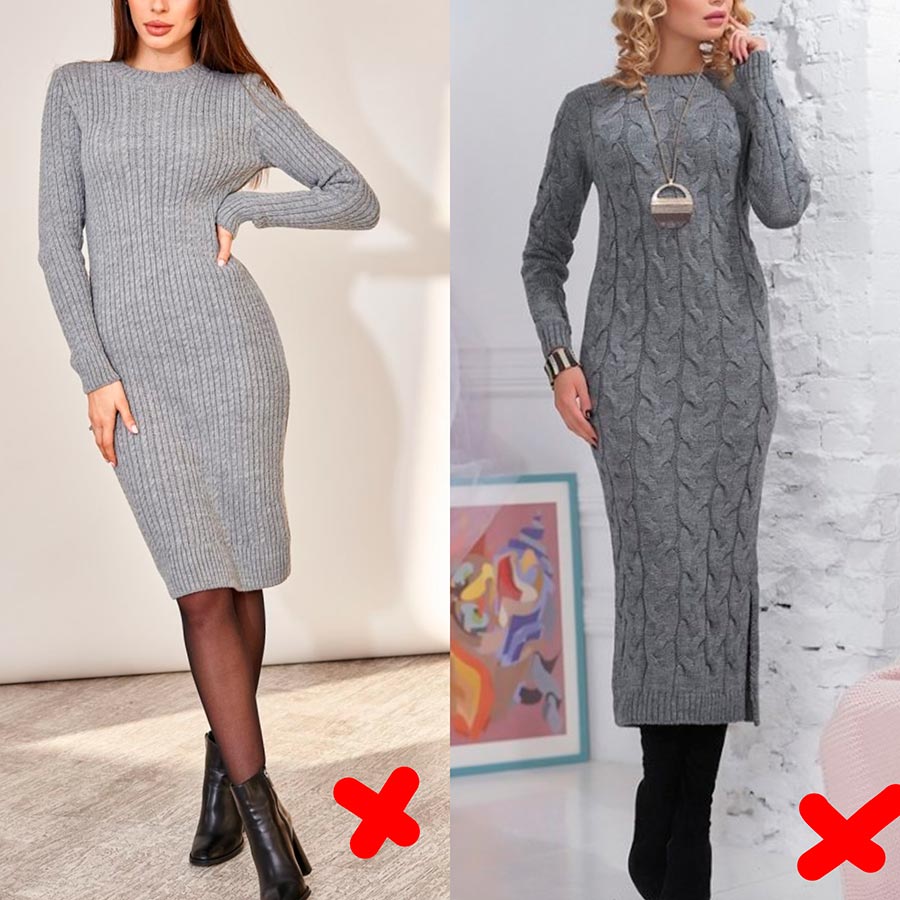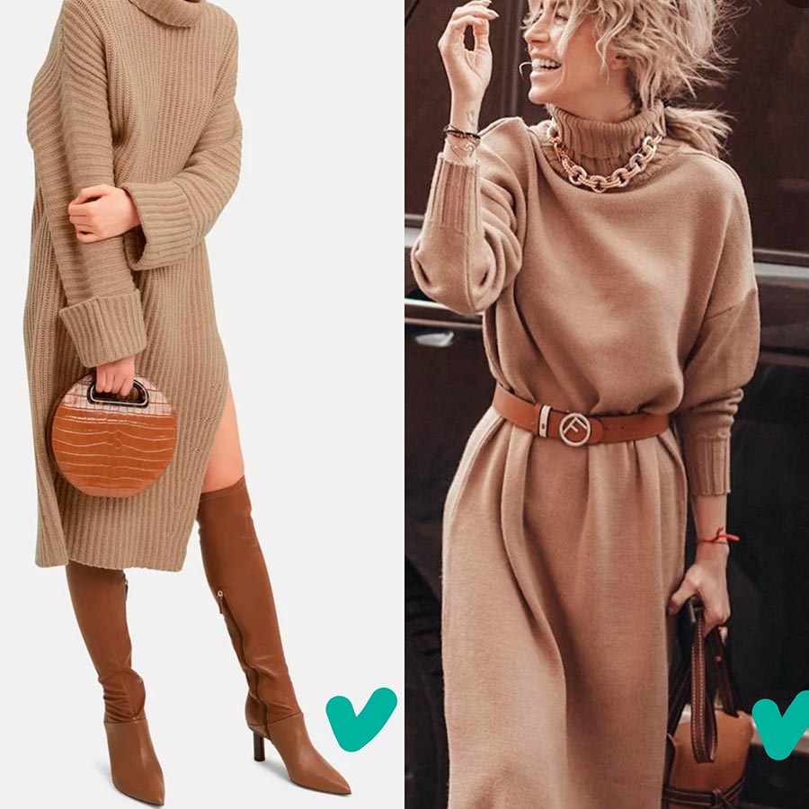 Au lieu de cela, je propose d'attirer votre attention sur des robes en tricot avec une coupe libre, une longueur midi et une texture lisse, elles s'intégreront également parfaitement dans la garde-robe d'une robe trapèze. Malgré la saison froide, nous continuons à porter des robes en mousseline, en les combinant avec des cardigans, des pulls et des pulls.