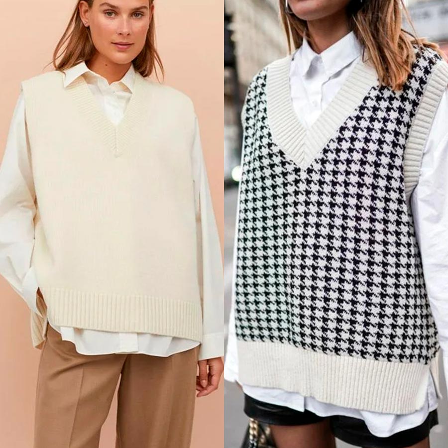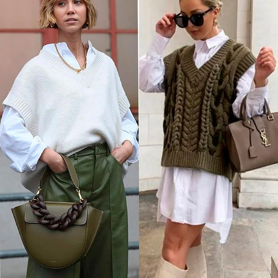 Amateurs de gilets, réjouissez-vous, ils sont de nouveau à la mode. Si vous savez tricoter, il est temps de vous procurer vos aiguilles à tricoter et de vous tricoter un gilet à col montant ou en V. Portez-les sur des chemises et des robes en mousseline de soie, avec des jupes et des pantalons.