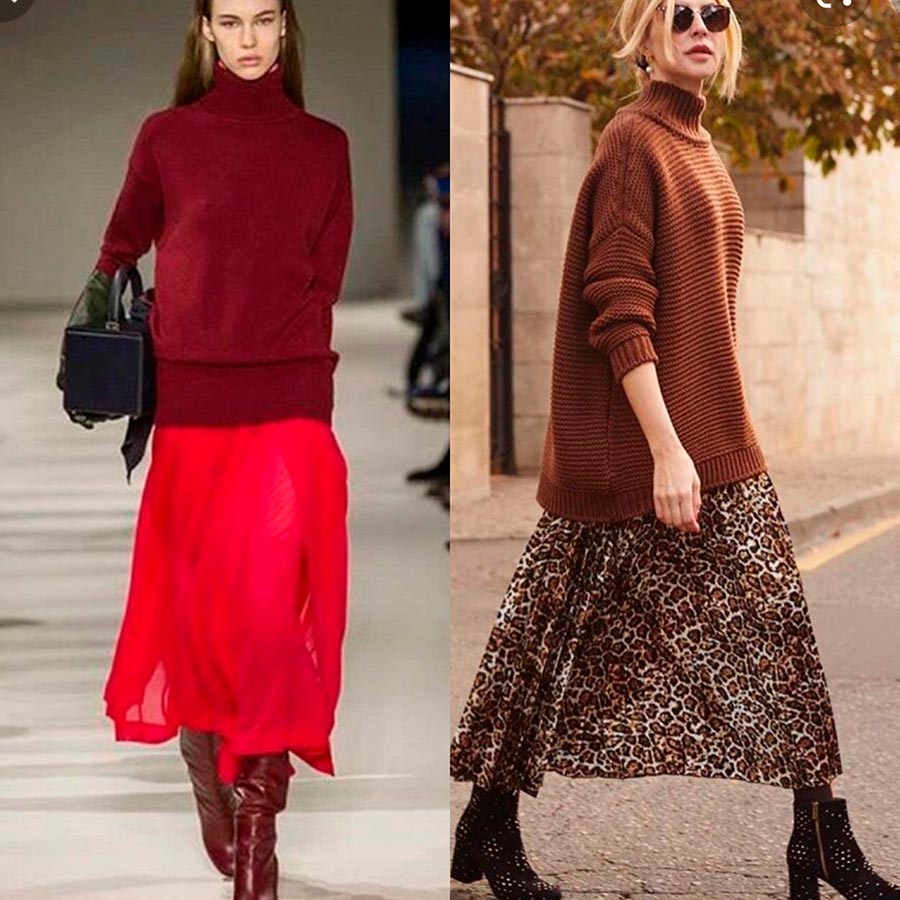 À propos des pulls, les modèles amples et confortables en cachemire et alpaga sont à la mode. Longueur à mi-cuisse ou plus. Ceux qui aiment porter la forme doivent faire attention aux modèles courts avec une encolure carrée et des manches bouffantes.
