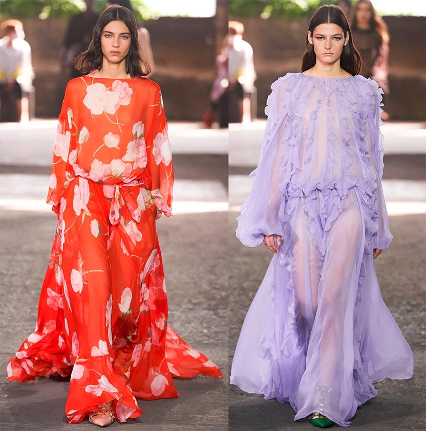 Malgré le fait qu'il soit impossible de prédire les événements de 2026, Pierpaolo Piccioli n'est pas allé tête baissée dans la pratique. Gardant à l'esprit l'héritage de Valentino - des robes de soirée luxueuses, pour la nouvelle saison, il a présenté des robes longues transparentes avec des volants, des volants et d'énormes fleurs exotiques.