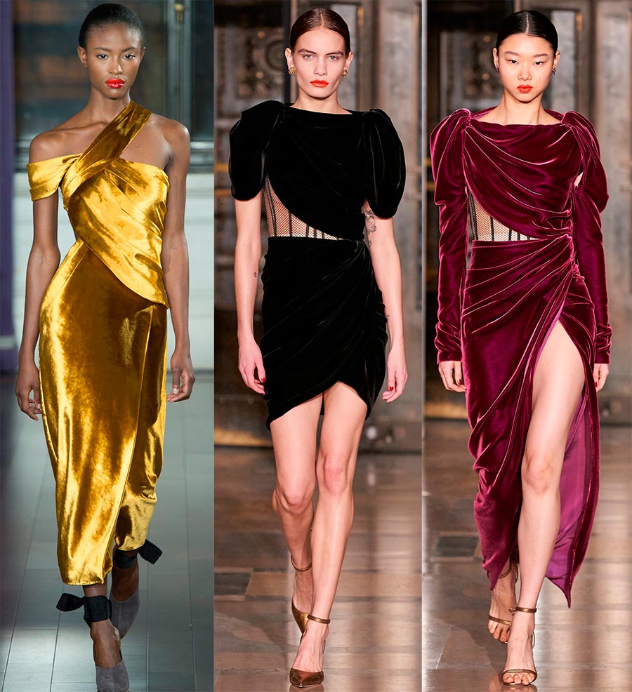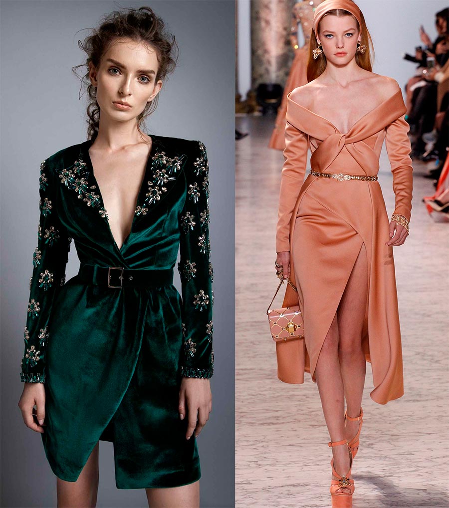 Une robe en velours à col bateau ou épaules nues soulignera la sophistication et le luxe de l'image. Cette saison, en plus du velours noir et bordeaux classique, les couleurs plus vives sont à la mode - émeraude, argent et écarlate. La robe en velours souligne parfaitement les courbes de la silhouette et permet de démontrer une excellente forme sans vulgarité inutile.