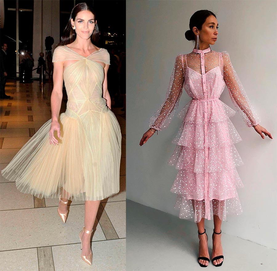 Ne privilégiez pas les nuances transparentes qui peuvent rendre votre look enfantin, optez pour des couleurs plus complexes : gris, blanc, poudré, beige, bleu sale. Si tout cela est trop romantique pour vous et que vous voulez une tenue plus audacieuse, ajoutez des bottes grossières, une veste en cuir ou un basque à une robe délicate duveteuse - l'image se révélera ultra-tendance.