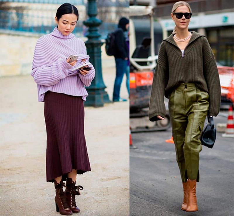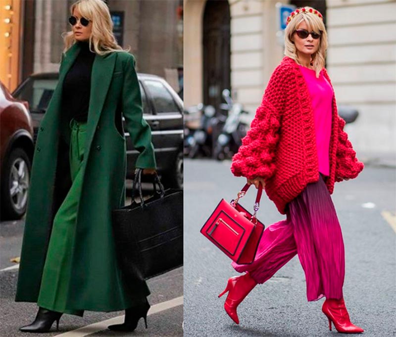 La combinaison de deux couleurs vives dans l'image coupe la silhouette, raccourcit la taille et les jambes, par conséquent, il vaut mieux ne pas porter de bas rouge, de haut vert, mais de porter un haut rouge ou un manteau jaune par-dessus une robe violette sous un costume vert. Mais si vous souhaitez combiner le bas d'une couleur et le haut d'une autre, vous pouvez choisir une jupe ou un pantalon taille haute et choisir des chaussures de la couleur de la jupe ou du pantalon.