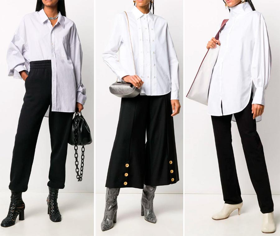 Theory, Elisabetta Franchi, Brunello Cucinelli montrent que l'on peut compléter un chemisier et une chemise blancs non seulement avec un bas noir mais aussi beige.
