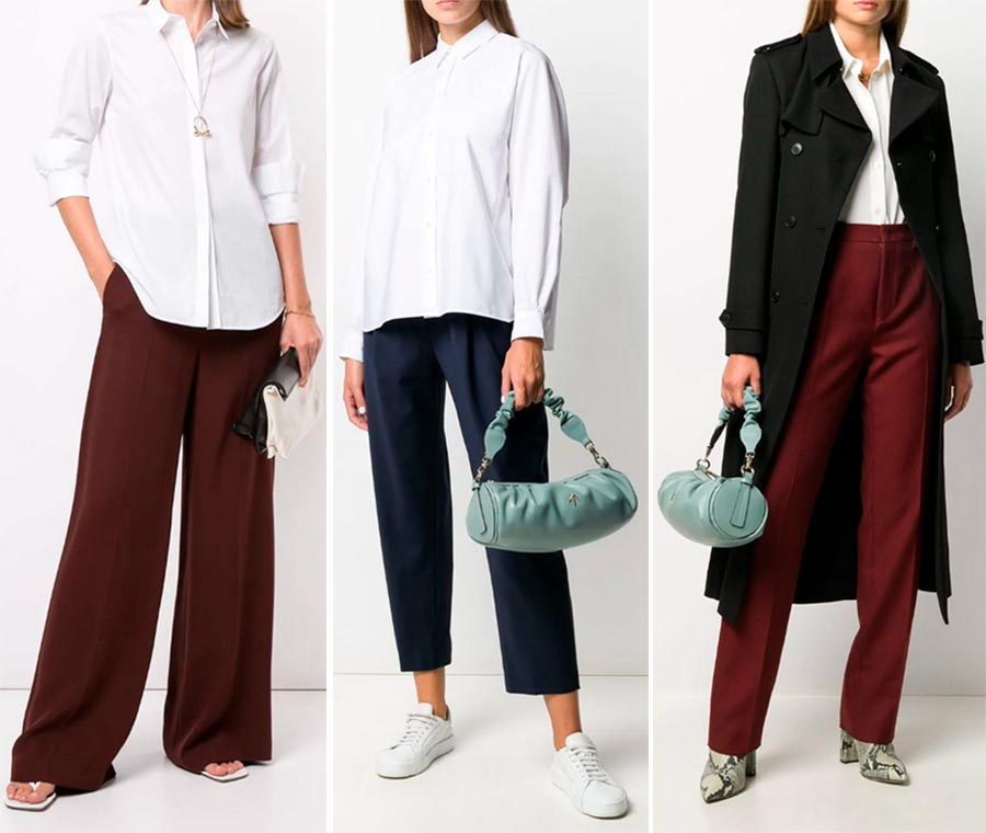 Si le code vestimentaire permet, comme à l'école, non seulement le noir, mais aussi le bleu foncé et le bordeaux, alors assurez-vous d'acheter un pantalon de ces couleurs pour compléter avec un chemisier blanc.