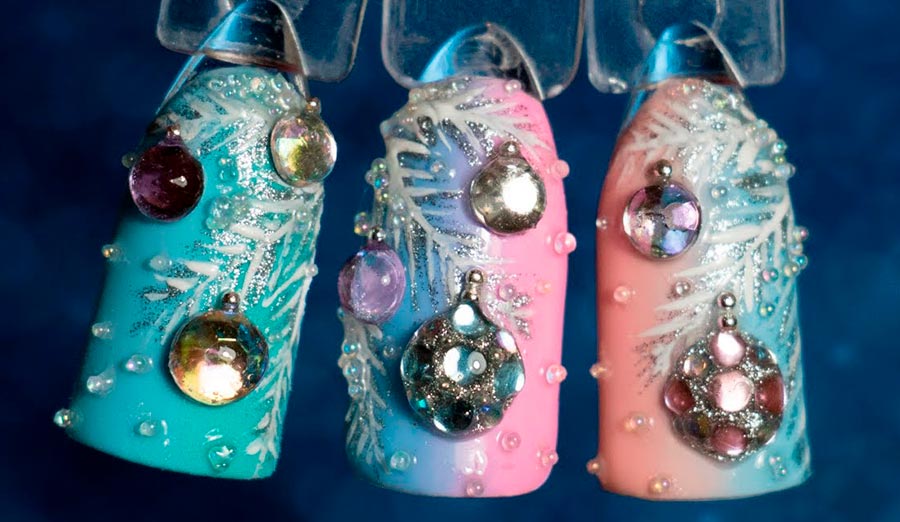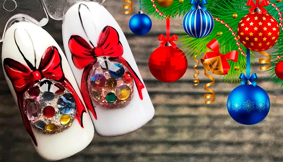 Pourquoi ne pas représenter toute la variété des décorations de sapin de Noël sur vos ongles ? L'arrière-plan des dessins peut être une couleur verte classique "arbre de Noël", sur laquelle vous pouvez dessiner des boules rouges, blanches, dorées et argentées, et utiliser non seulement des paillettes et du papier d'aluminium, mais également des strass.