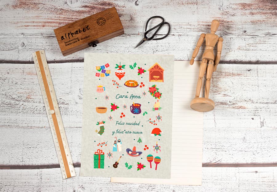 Transformons maintenant cette carte en une authentique carte postale vintage, par exemple, dans un style mexicain. Pour cela, dans l'onglet "Éléments", écrivez "Noël mexicain" et remplacez les éléments existants par des éléments mexicains. Ce sont des plats traditionnels, des boissons, des éléments décoratifs - chaque élément a une description et une liste de mots-clés, grâce auxquels vous pouvez toujours savoir ce qui est exactement montré dans l'image. La félicitation elle-même, bien sûr, nous écrivons en espagnol.