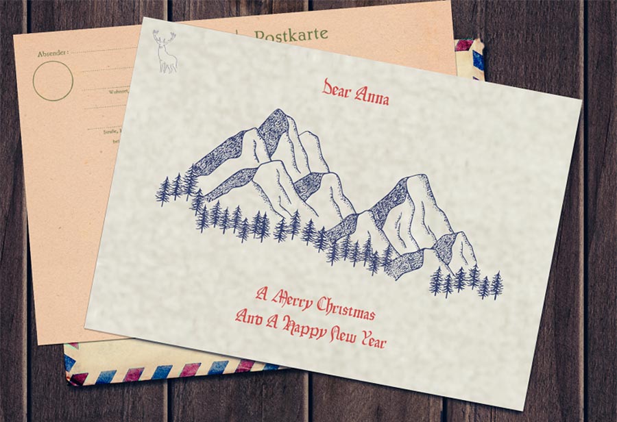 Si vous souhaitez concevoir une carte de Noël personnalisée dans le style occidental de la fin du siècle dernier, il vous suffit de trouver un modèle qui correspond au style et de choisir une belle police. Dans cette mise en page terminée, nous venons de supprimer quelques éléments pour faire de la place au texte (police Bellaboo). Aucun autre changement n'a été nécessaire.