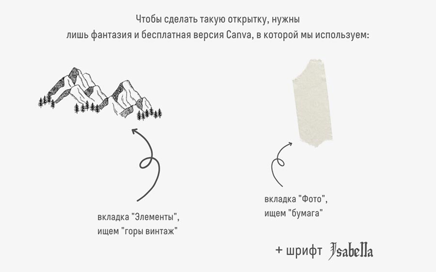 Comment faire? Ouvrez l'onglet "Photos", sélectionnez uniquement les images gratuites dans le filtre, écrivez "carte postale vintage" dans la barre de recherche. Nous voyons diverses options qui peuvent être utilisées de quelque manière que ce soit à des fins non commerciales, y compris sous la forme originale. Si vous le souhaitez, vous pouvez simplement laisser l'arrière-plan comme il semble naturel et faire tout le reste à votre manière (nous recherchons des formes et des lignes dans l'onglet "Éléments", sélectionnez l'ancienne police dans la liste des polices lors de l'édition). L'exemple ci-dessus est le verso d'une vieille carte postale allemande. Nous n'en avons retiré que quelques fragments pour le rendre plus propre. Vous pouvez également simplement prendre n'importe quelle image d'un morceau de papier de la bibliothèque (onglet « Photos », rechercher « papier » et l'utiliser comme arrière-plan.
