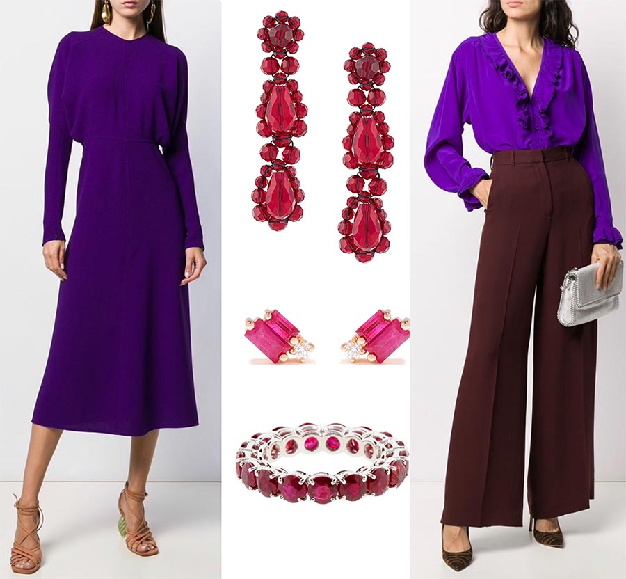Les tons violets sont juteux soulignés par le grenat rouge et les bijoux rubis.