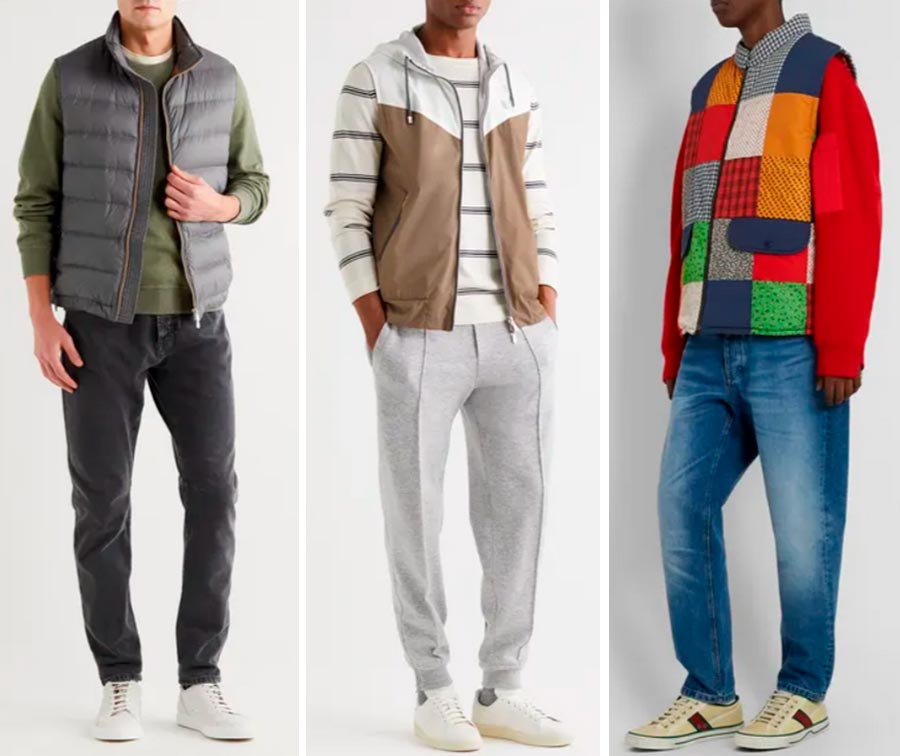 Les sweats vont bien avec les gilets. Le conservateur choisira certainement un gilet bouffant classique, l'amoureux de la liberté jouera avec la coupe, en combinant le gilet non pas avec un jean, mais avec un pantalon de survêtement, et une personne vivant à la mode se dégagera pleinement des couleurs du gilet.