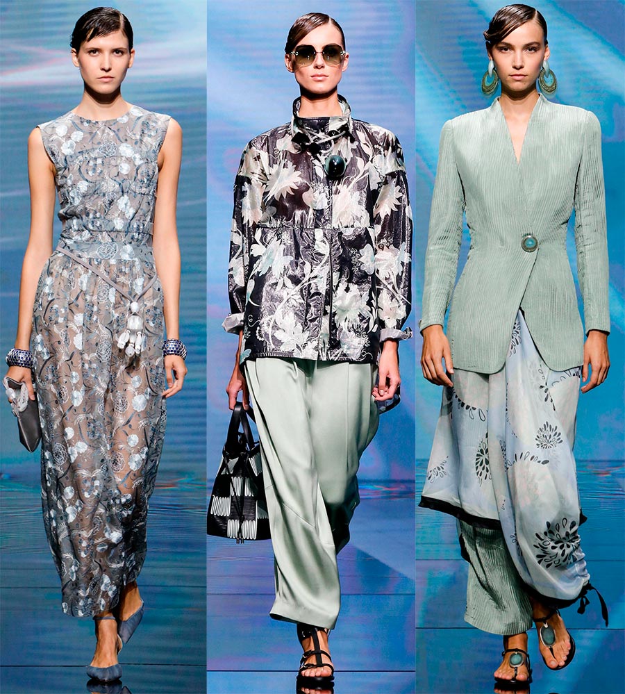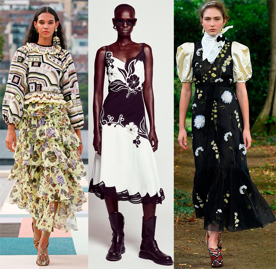 Les designers expérimentent avec des tissus, des textures et des décors. Des compositions florales se dévoilent sur des robes en mousseline, satin et soie. Ils sont bons dans les robes et les jupes, les hauts et les chemisiers, les pulls et les salopettes.