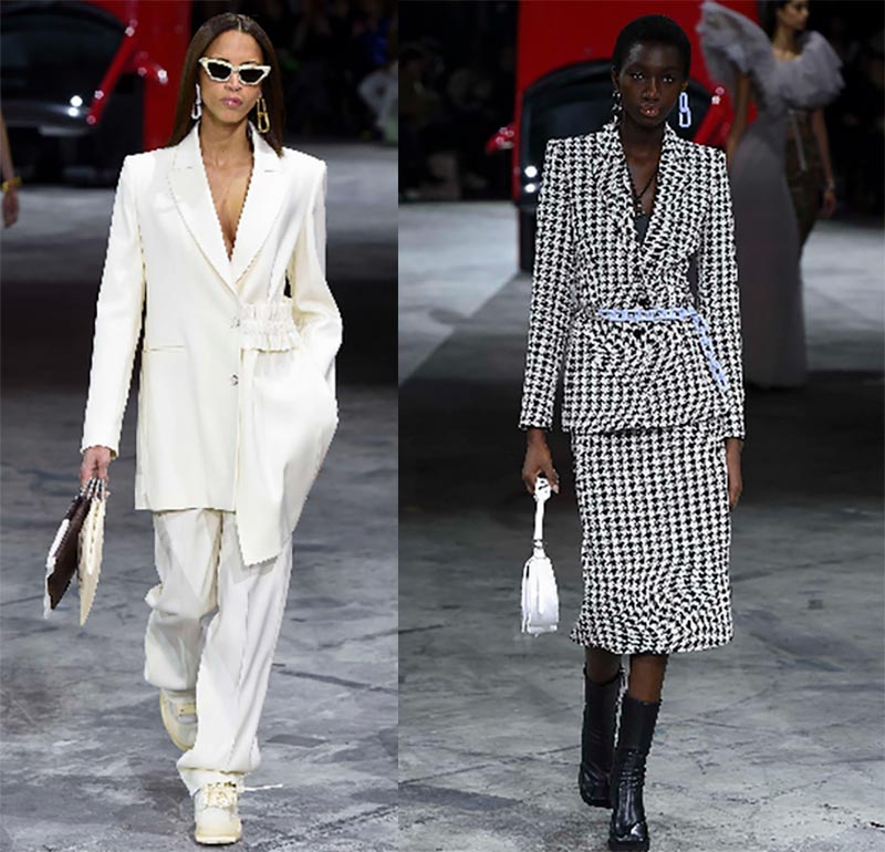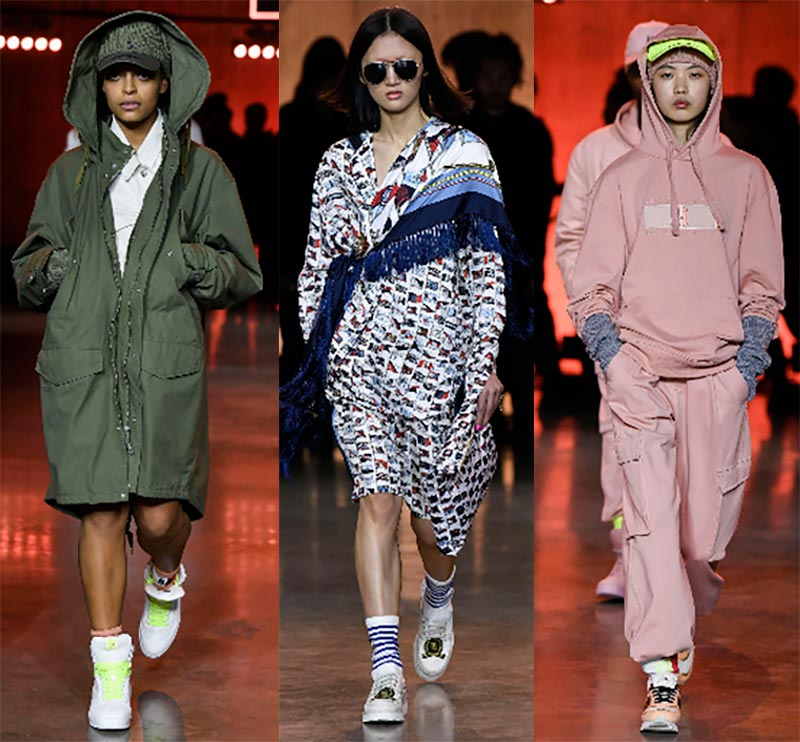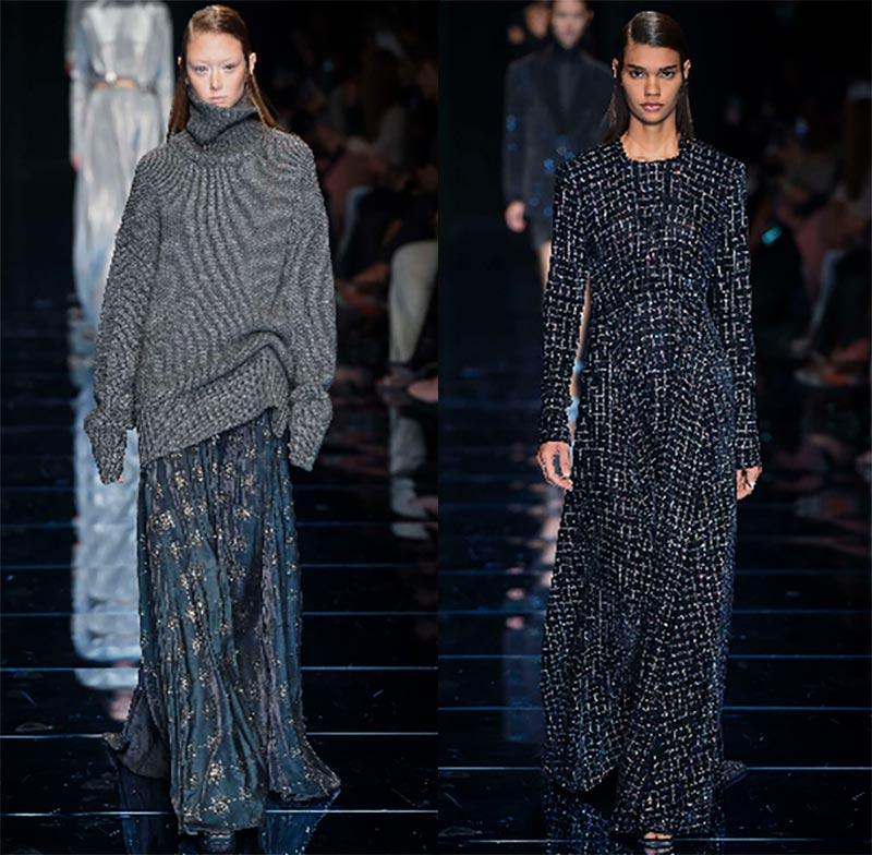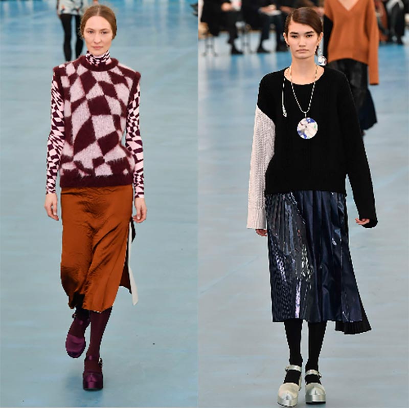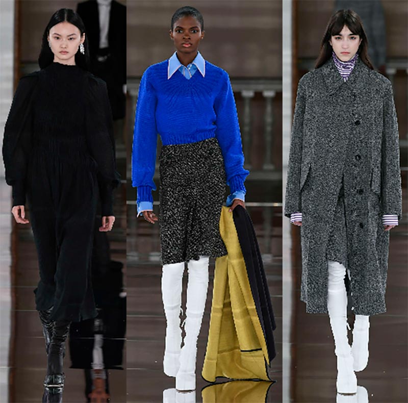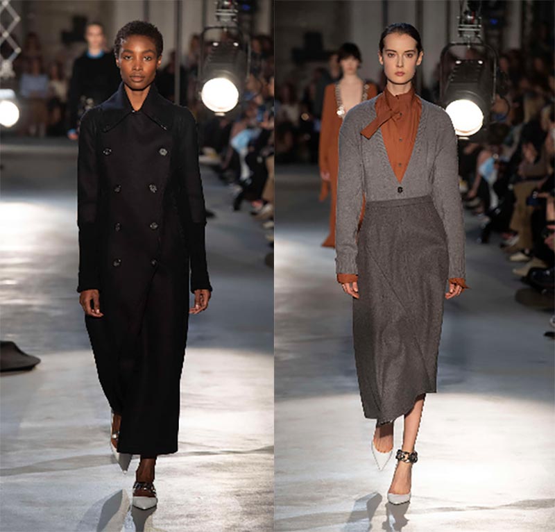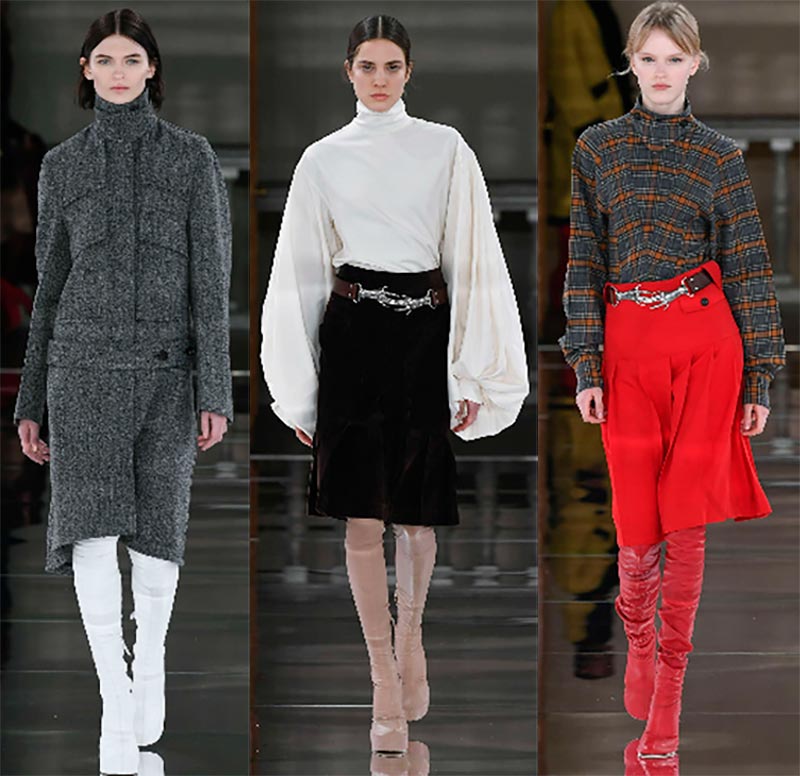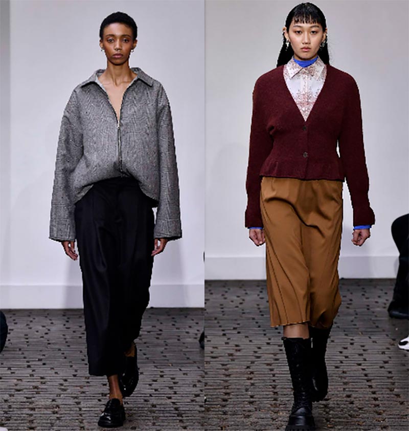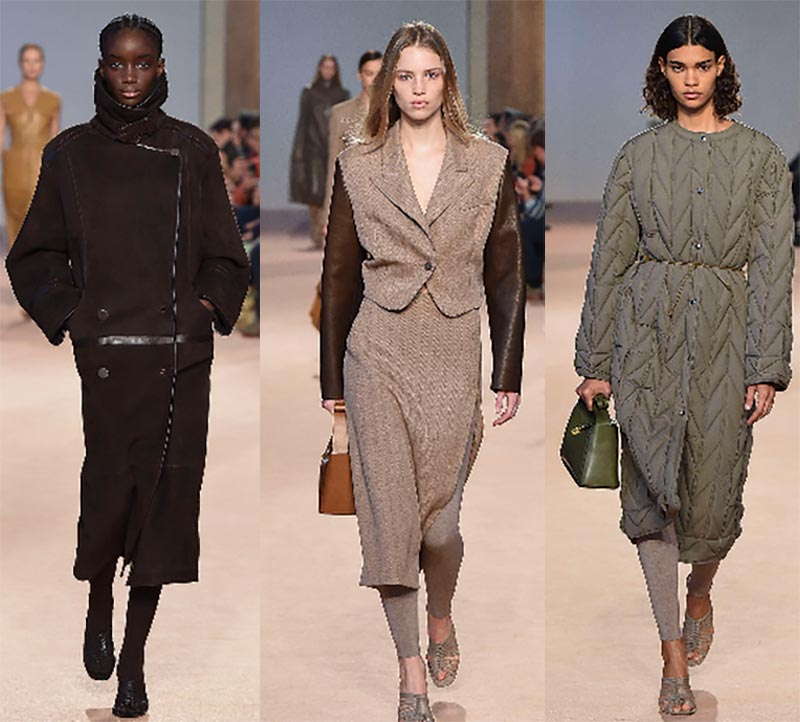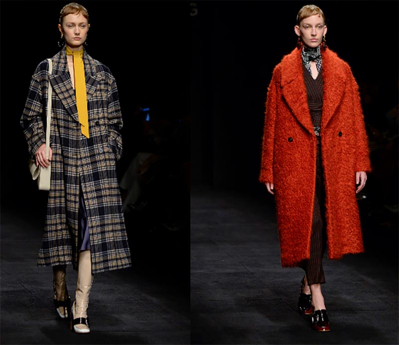 Les stylistes de la marque proposent de porter des manteaux à carreaux et des manteaux bouclés avec des foulards serrés, des pantalons courts et des jupes en satin.