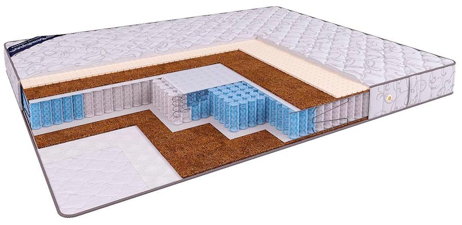 - Une petite couche de coco. C'est l'option la plus couramment utilisée. La hauteur de la couche varie de 1 à 3 cm et est utilisée en combinaison avec des blocs à ressort et d'autres charges. En fonction de l'épaisseur de la fibre de coco et de son association avec des blocs ressorts et autres charges, les fabricants parviennent à faire varier le niveau de rigidité de la couchette.