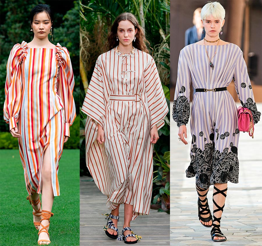 Il n'y aura pas d'erreur si nous commençons par des robes à rayures. Oui, cette impression est courante. Dans la nouvelle saison, les créateurs envisagent souvent les tissus à fines rayures, bien qu'il y ait aussi une rayure colorée. Mais il y a beaucoup moins d'imprimés à rayures fantastiques.
