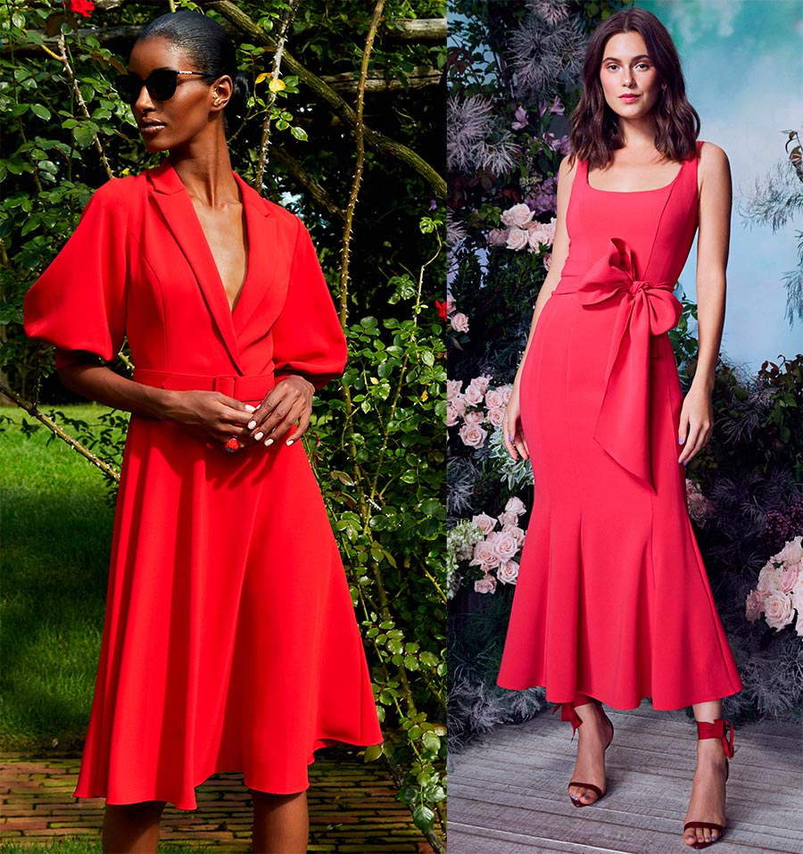 Nuances rouges, parmi lesquelles les robes cramoisies ressortent particulièrement bien.