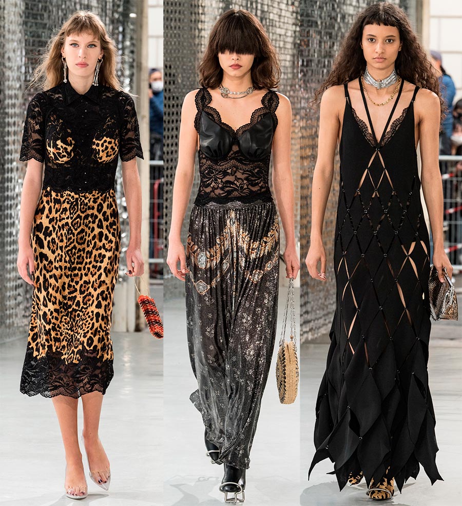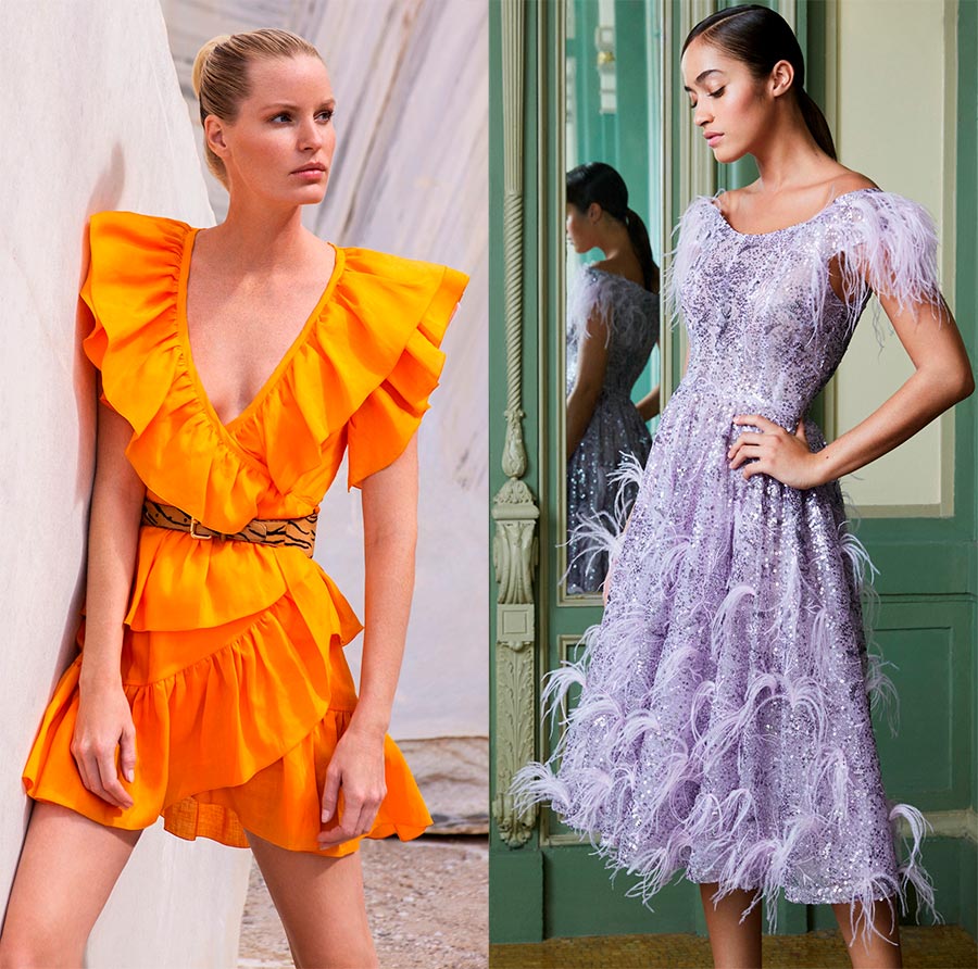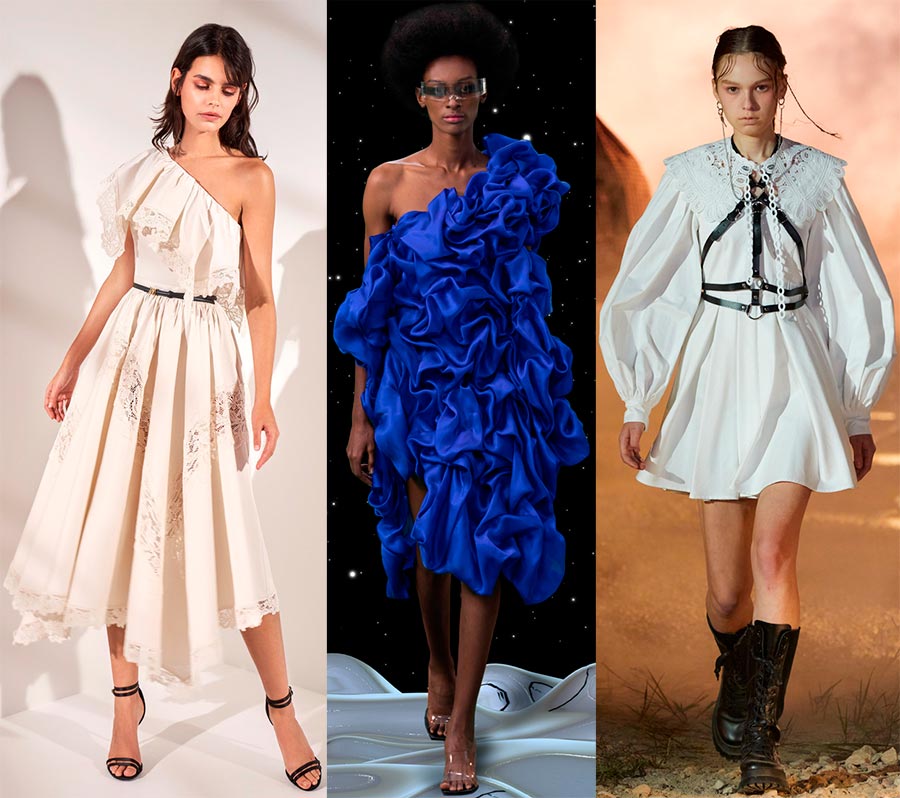 Fendi a utilisé l'ourlet sur quelques modèles, Rokh a décoré ses robes de cols et de bretelles. Comme toujours, la collection Paco Rabanne a des idées originales avec des éléments métalliques, et Zuhair Murad a orné les robes de volants en dentelle.