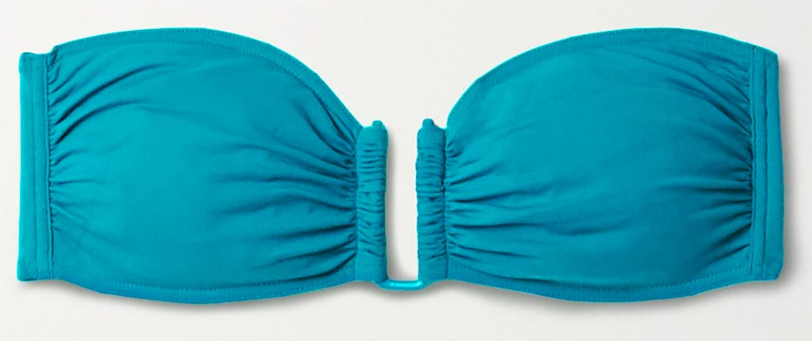 Bando... Idéal pour les filles avec de petits seins. Ceux-ci peuvent être des corsages en forme de tissu à rayures, avec ou sans bretelles, des versions torsadées du style Victoria Secret. Ces bikinis s'adaptent confortablement, ont fière allure, rendant la silhouette plus féminine. Un grand imprimé et des nuances claires feront l'affaire pour ajouter visuellement du volume à la poitrine, si vous en avez besoin. Des hauts de ce type figuraient dans la collection croisière Chanel 2026.