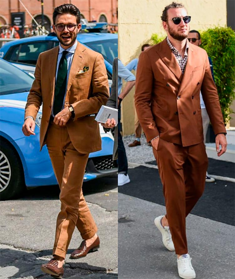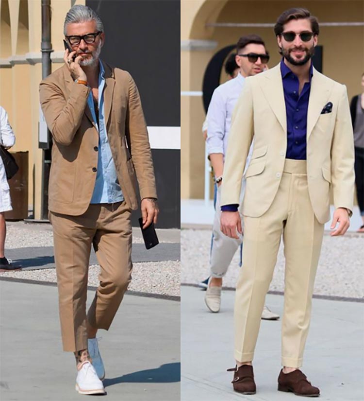 Costumes beiges La couleur beige est parfaite pour un costume d'été pour tous les jours. La couleur est neutre, elle se combine donc avec n'importe quelle couleur en termes de saturation et de chaleur.