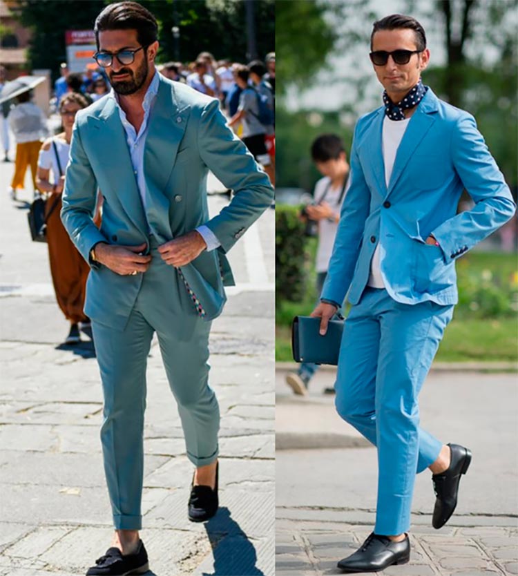 Costumes lumineux bleus Un costume bleu et des costumes avec un motif peuvent être dans la garde-robe, mais en tant que deuxième, troisième, mais pas premier costume. Le fuchsia est en vogue cette saison, cette couleur est idéalement combinée avec un bleu riche.