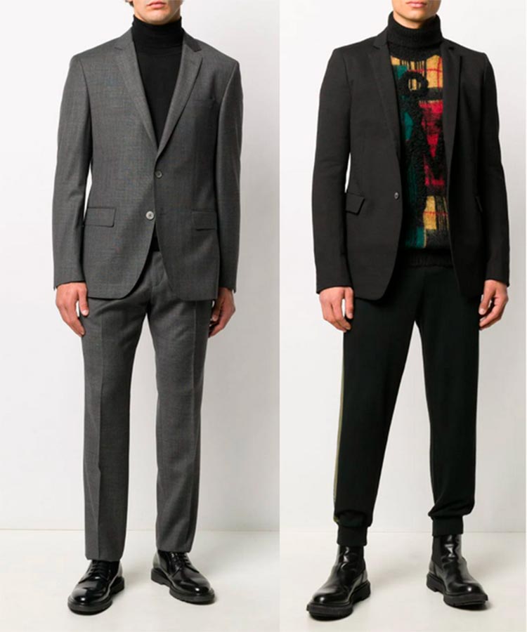 Costumes gris Un costume gris n'a pas l'air formel. Le modèle est adapté à un usage quotidien. Se marie bien avec un t-shirt blanc et un col roulé noir.