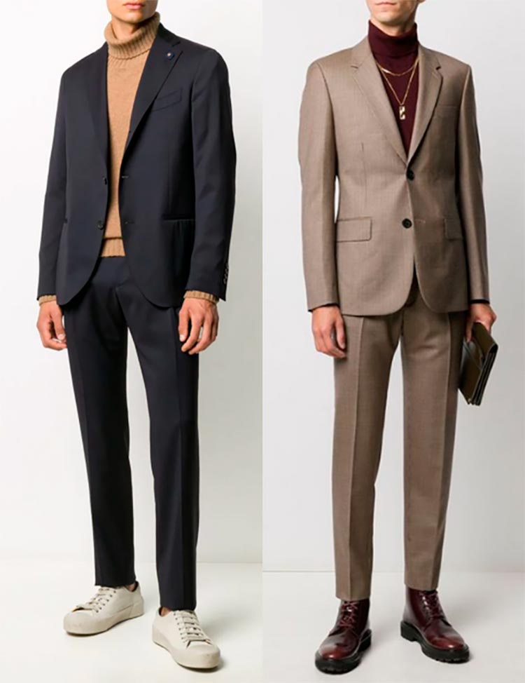 La solution la plus simple consiste à combiner des costumes avec des chemises en coton, mais si le code vestimentaire permet des expériences élégantes dans les cadres, alors les cols roulés, les T-shirts, les pulls fins ou les gilets en tricot auront fière allure avec les costumes.