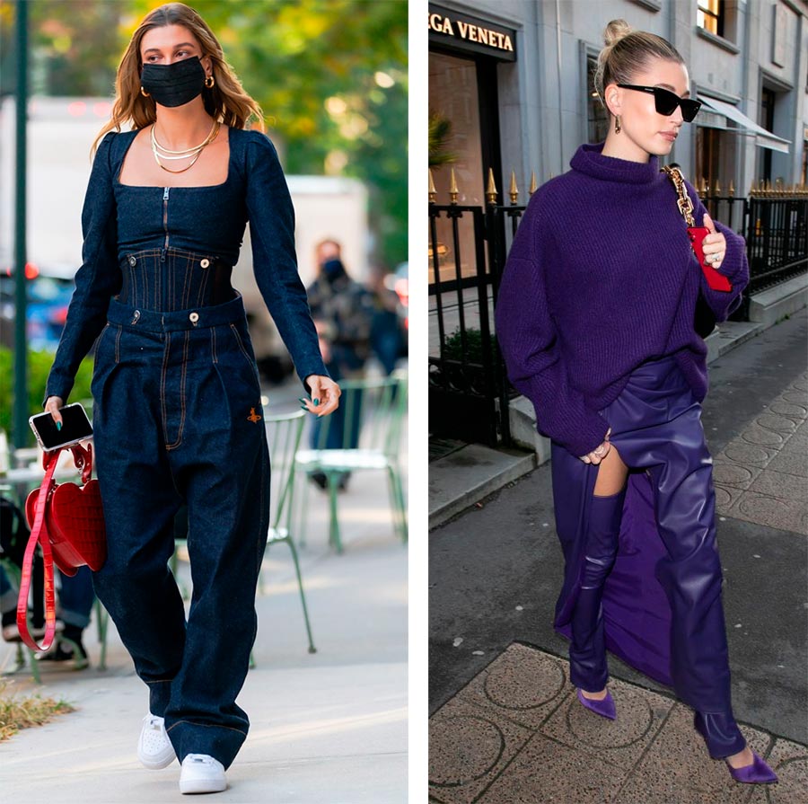 La femme de Justin Bieber aime visiblement combiner différents styles vestimentaires : on la voit souvent dans un ensemble tendance gagnant-gagnant blazer oversize + jogging + sandales à petits talons. En même temps, elle ne manque pas l'occasion d'ajouter des notes de sexualité et d'audace à ses images - Haley Bieber met en valeur sa silhouette idéale avec des robes mini-longues, des crop tops et des pantalons en latex adaptés.
