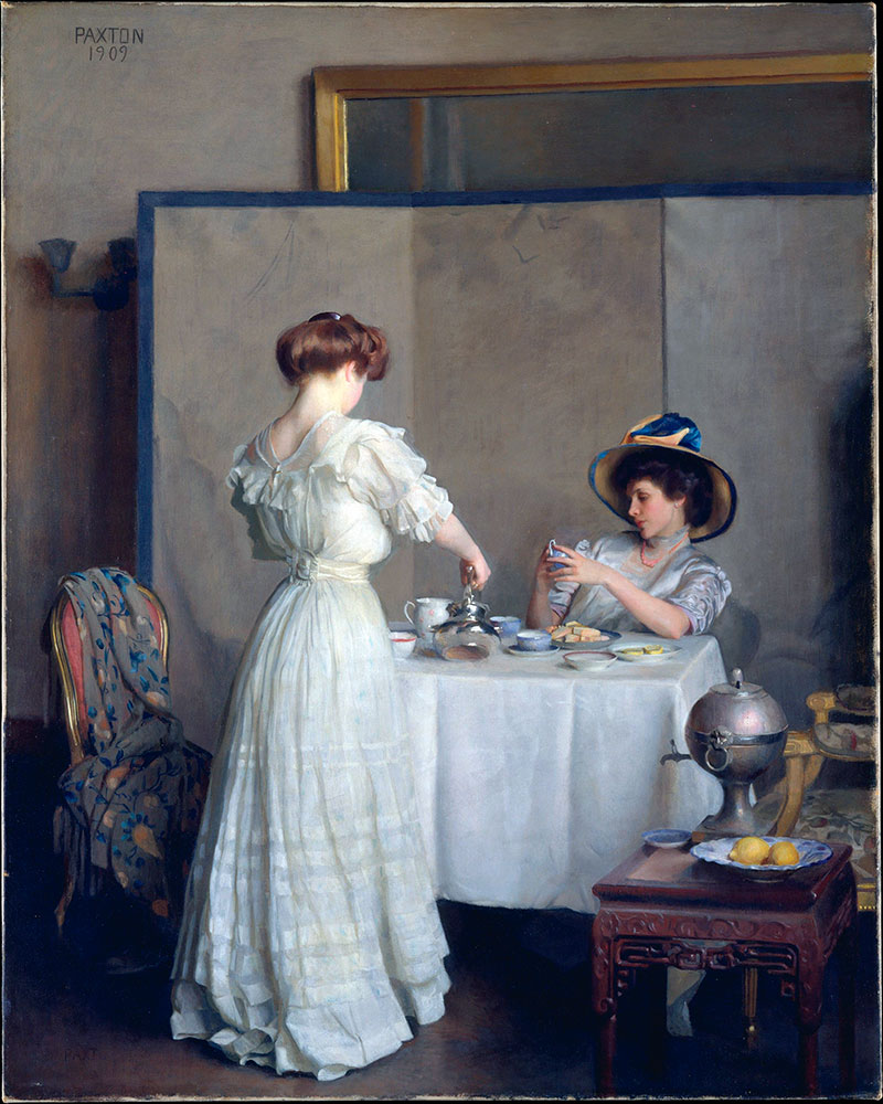 La robe de thé était faite de matériaux légers et avait l'air féminine et romantique. Dans les années 70 du XIXe siècle, il était de coutume d'organiser des cérémonies du thé de 16h à 17h, en été de tels moments agréables se déroulaient sur une véranda ouverte ou dans un jardin. Cette tradition a commencé en Angleterre. Toute l'élite britannique et la cour royale à cette époque ont quitté l'agitation et les soucis, se sont réunies à table pour s'asseoir facilement et naturellement avec une tasse de thé parfumé.