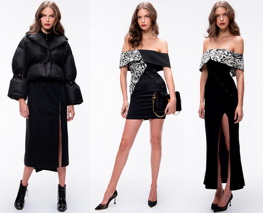 Philosophie de Lorenzo SerafiniDétails : robe bustier, mini noir, jupe longue avec une fente haute, leggings, laçage.
