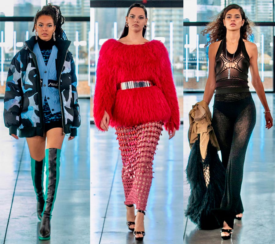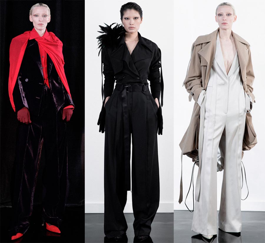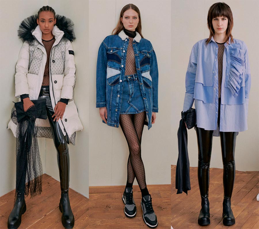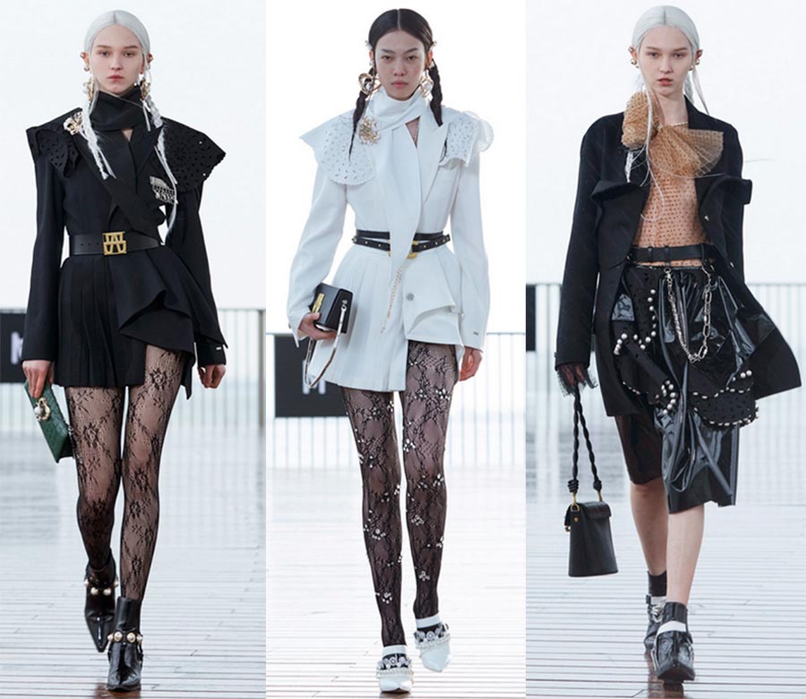 Philippe limDétails : collants en grosse maille, robes moulantes en maille dense, coupes asymétriques, tailleurs en dentelle.