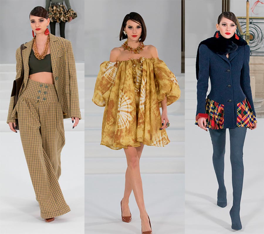Paul CostelloeDétails : crop tops, épaules dénudées, manteaux courts sans jupe, mais avec des collants colorés.