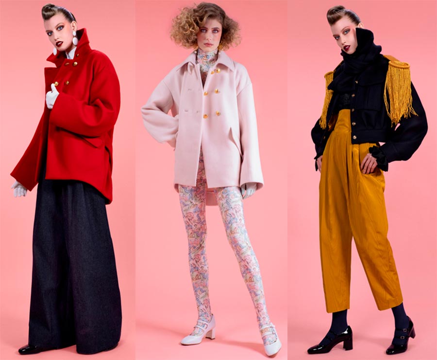Tailler GoldschmidtDétails : collants imprimés associés à des manteaux courts, rouge, militaire.