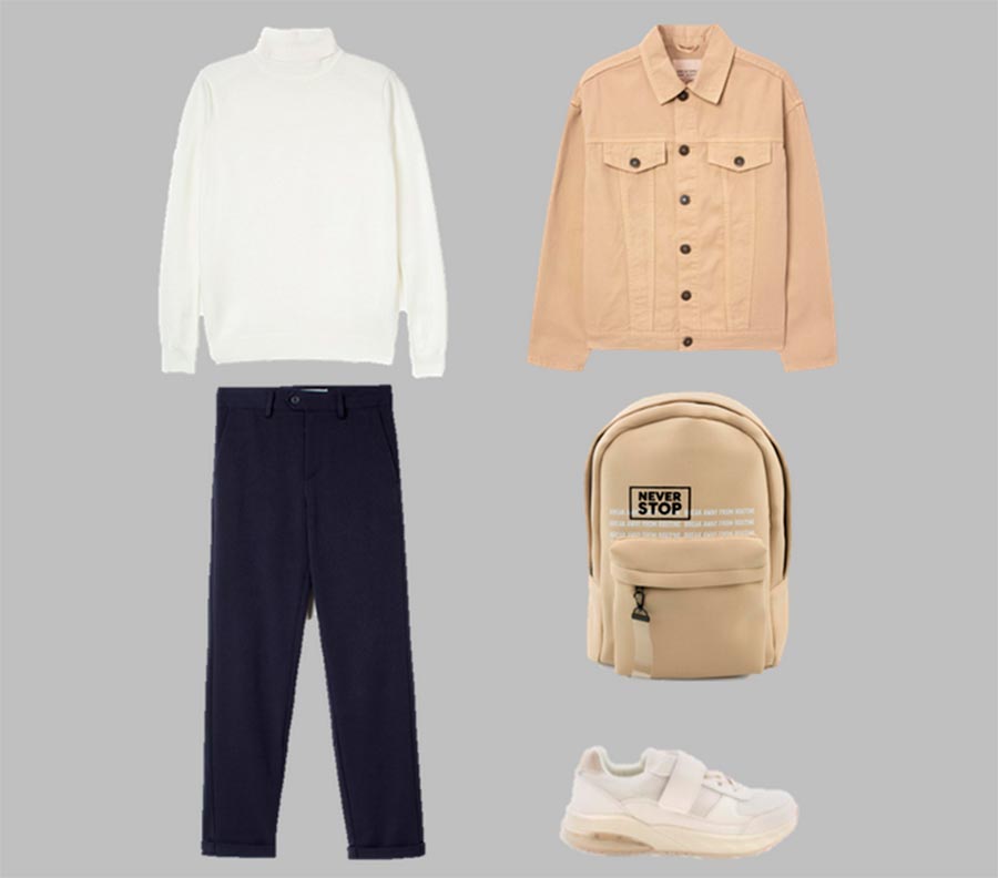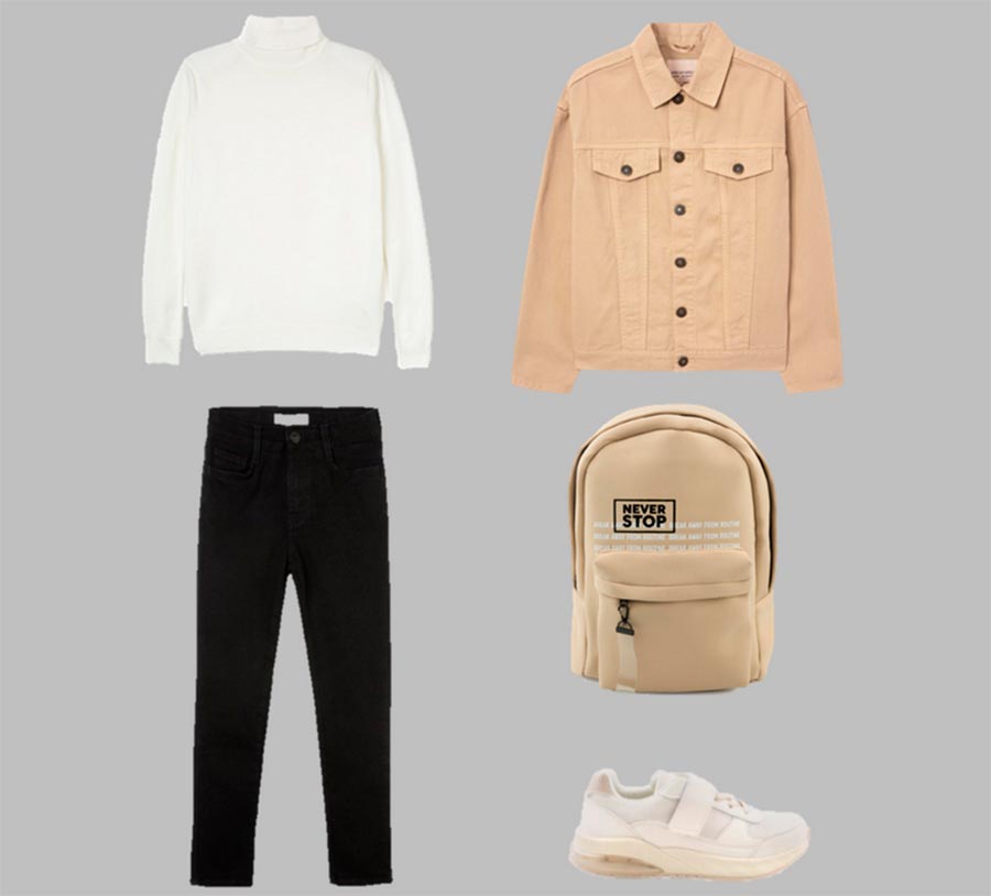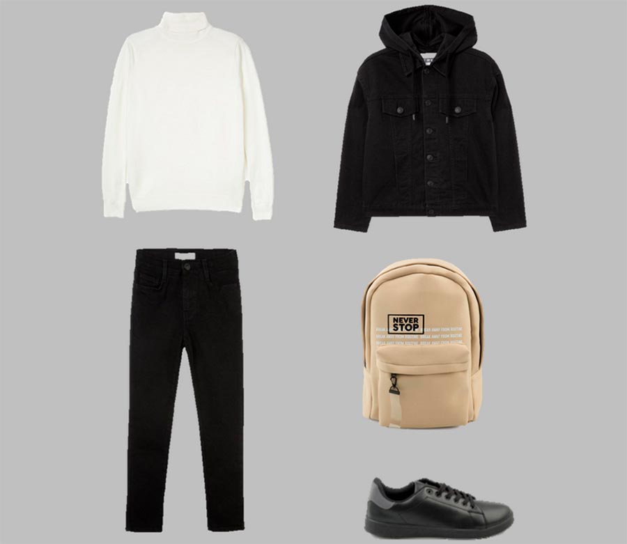 Qu'est-ce qui peut rendre les images scolaires décontractées ? Chapeaux, sacs ceinture, vestes en cuir et en jean. Un polo à manches longues peut remplacer une chemise blanche dans votre garde-robe. Au lieu d'une chemise, on enfile un col roulé avec un costume.