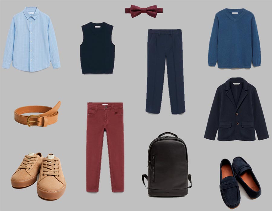 Certaines écoles ajoutent du bordeaux à la palette de couleurs pour le bleu foncé et le noir. Si vous avez de la chance que le bordeaux soit acceptable à l'école, voyez quelle capsule pour garçon peut être assemblée à Mango.