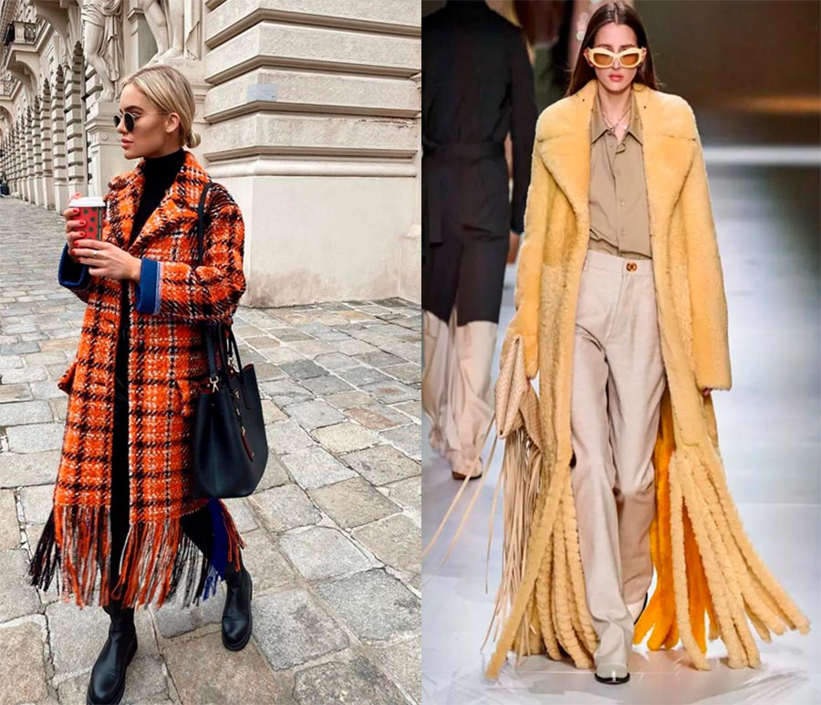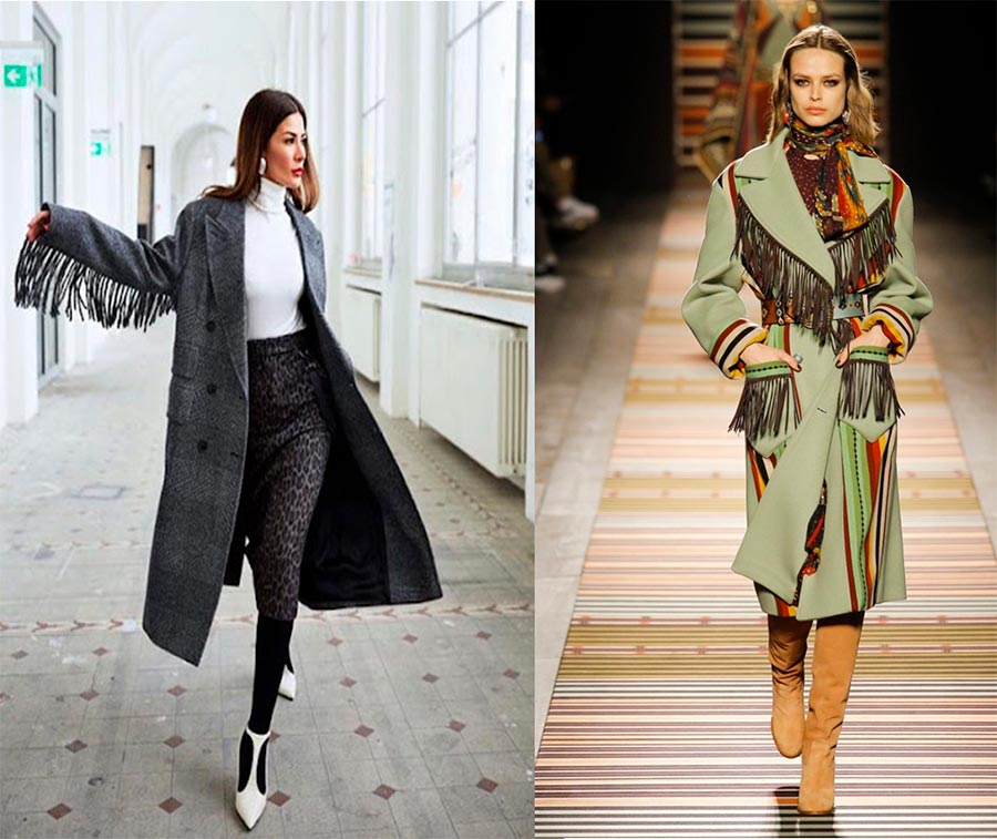 Si vous n'êtes pas prête à vous démarquer et à porter des couleurs vives, mais que vous souhaitez être dans la tendance, je vous conseille de regarder de plus près les choses avec des franges, notamment les manteaux. Ce détail des vêtements ne laissera personne indifférent, élégant et beau à la fois. Il existe maintenant sur le marché un grand nombre de manteaux à franges de différentes couleurs et styles. Je pense que chacun peut choisir celui qui lui convient le mieux.