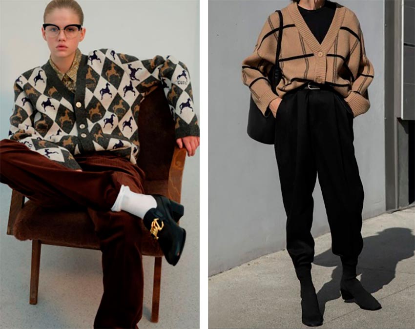 Le parfait cardigan « grand-père » est une chose unique, il peut être avec des boutons ou avec une fermeture éclair. Vous pouvez le porter avec un jean, des mini-jupes et des jupes midi, une excellente option avec une jupe plissée. Vous aurez l'air incroyablement à la mode, et en même temps, le cardigan ajoutera de la douceur à l'image, même s'il est masculin.