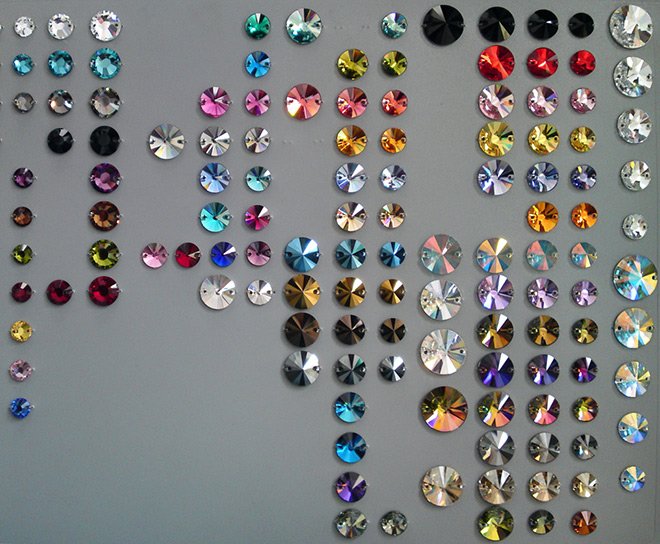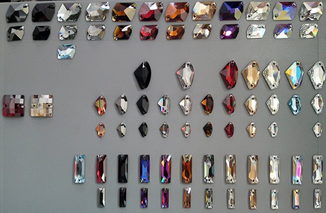 L'effet de différentes couleurs est créé en appliquant une couche de feuille réfléchissante spéciale au bas des strass. Lorsqu'une couche spéciale est pulvérisée sur la surface des strass, il est possible de changer la couleur et d'améliorer la brillance.