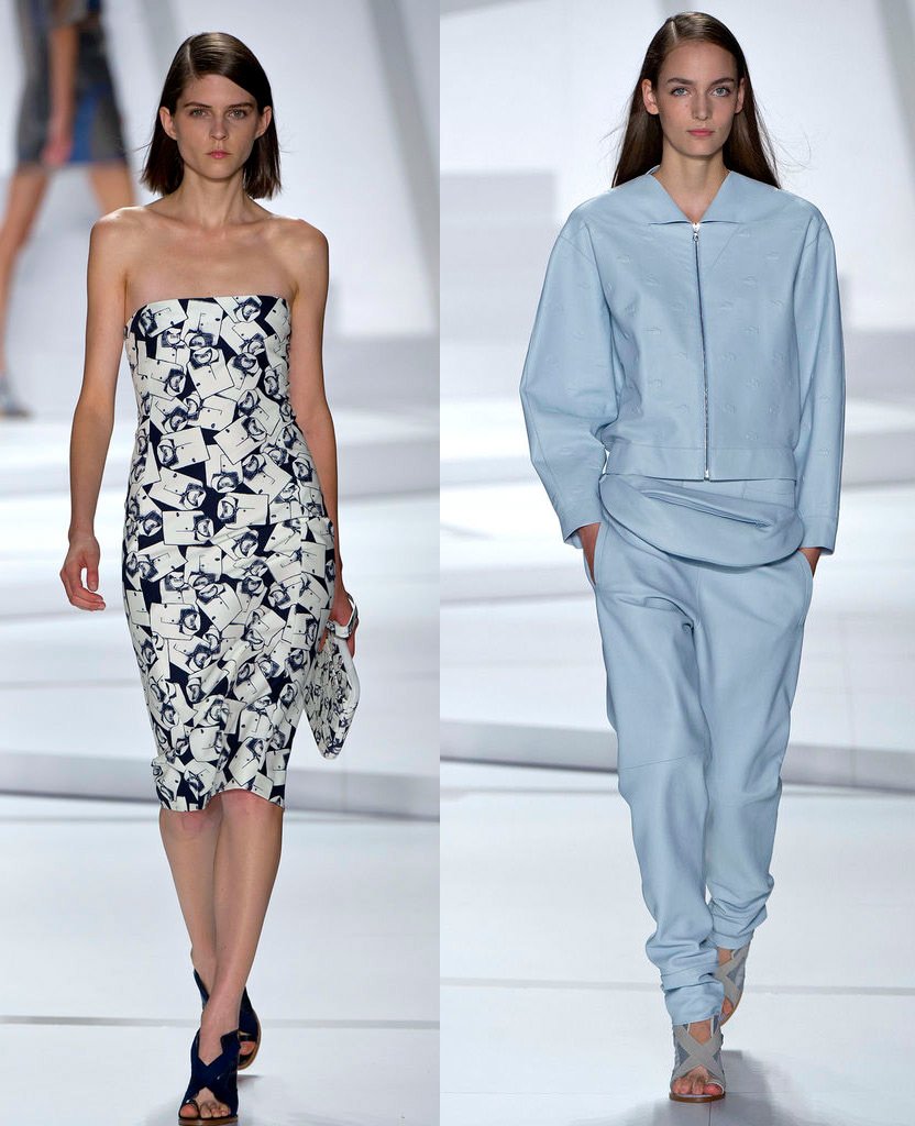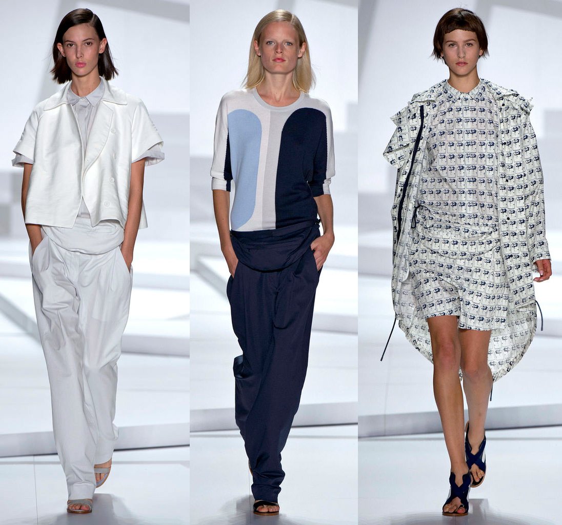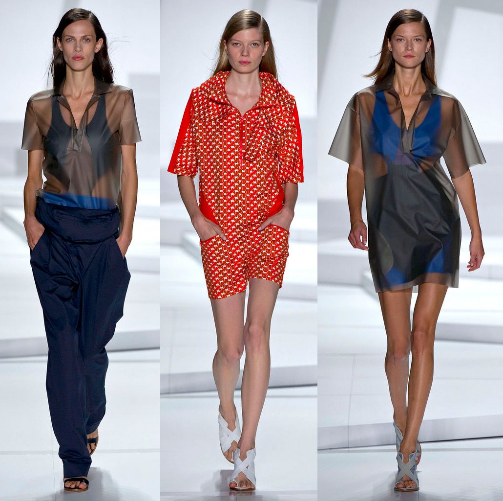En général, la collection Lacoste contient beaucoup de robes courtes et de pantalons. La collection est tout à fait portable. Les téléspectateurs de l'émission se souvenaient cependant sans aucun doute de la robe à manches courtes et larges, sur laquelle les emblématiques polos Lacoste étaient disposés en rangées régulières, alors qu'ils étaient pliés comme sur une étagère dans un magasin - un dispositif très ironique.