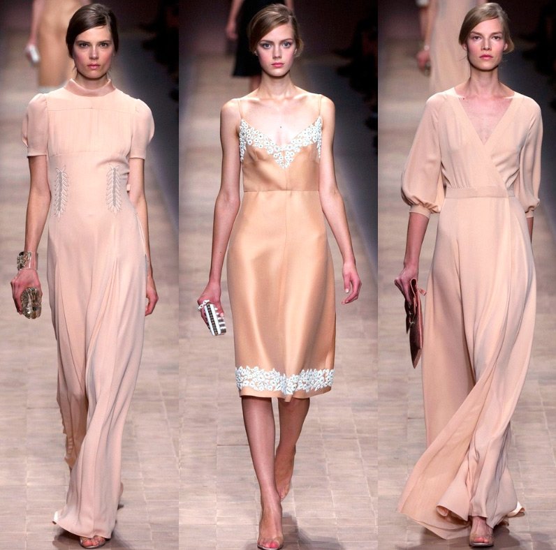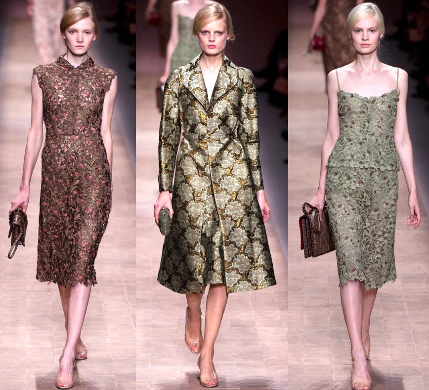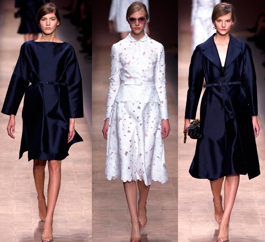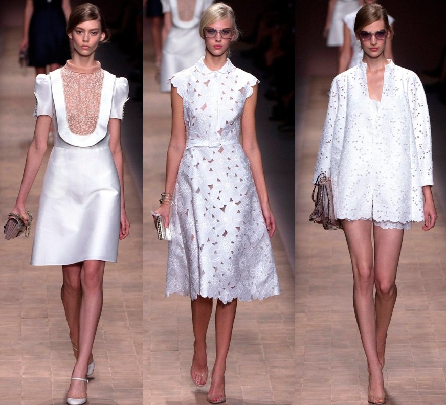 Le cuir a été savamment "transformé" en dentelle, les silhouettes - traditionnelles pour Valentino - sont allongées. Couleurs - écarlate vif, blanc, beige, noir, bleu royal.